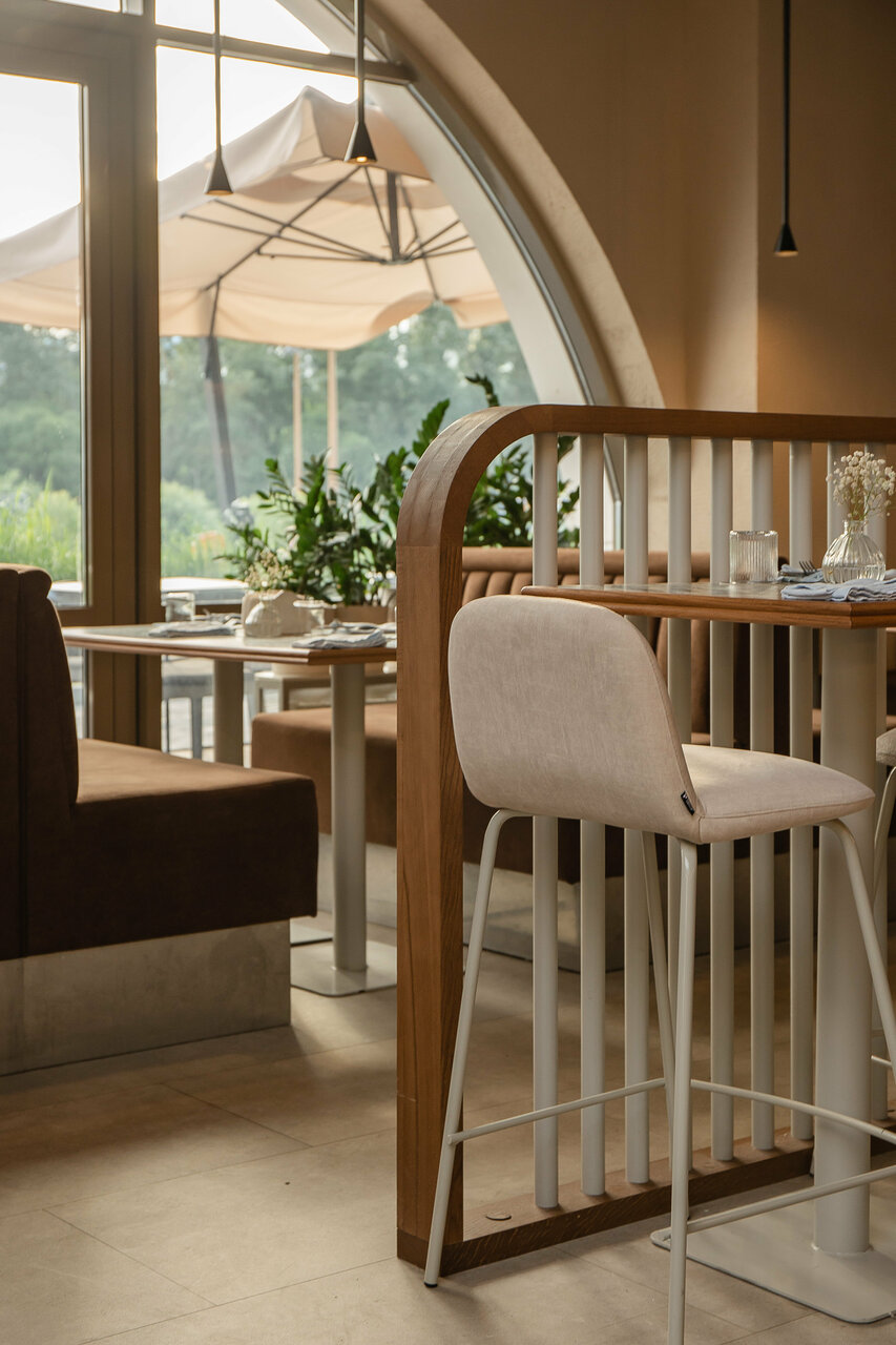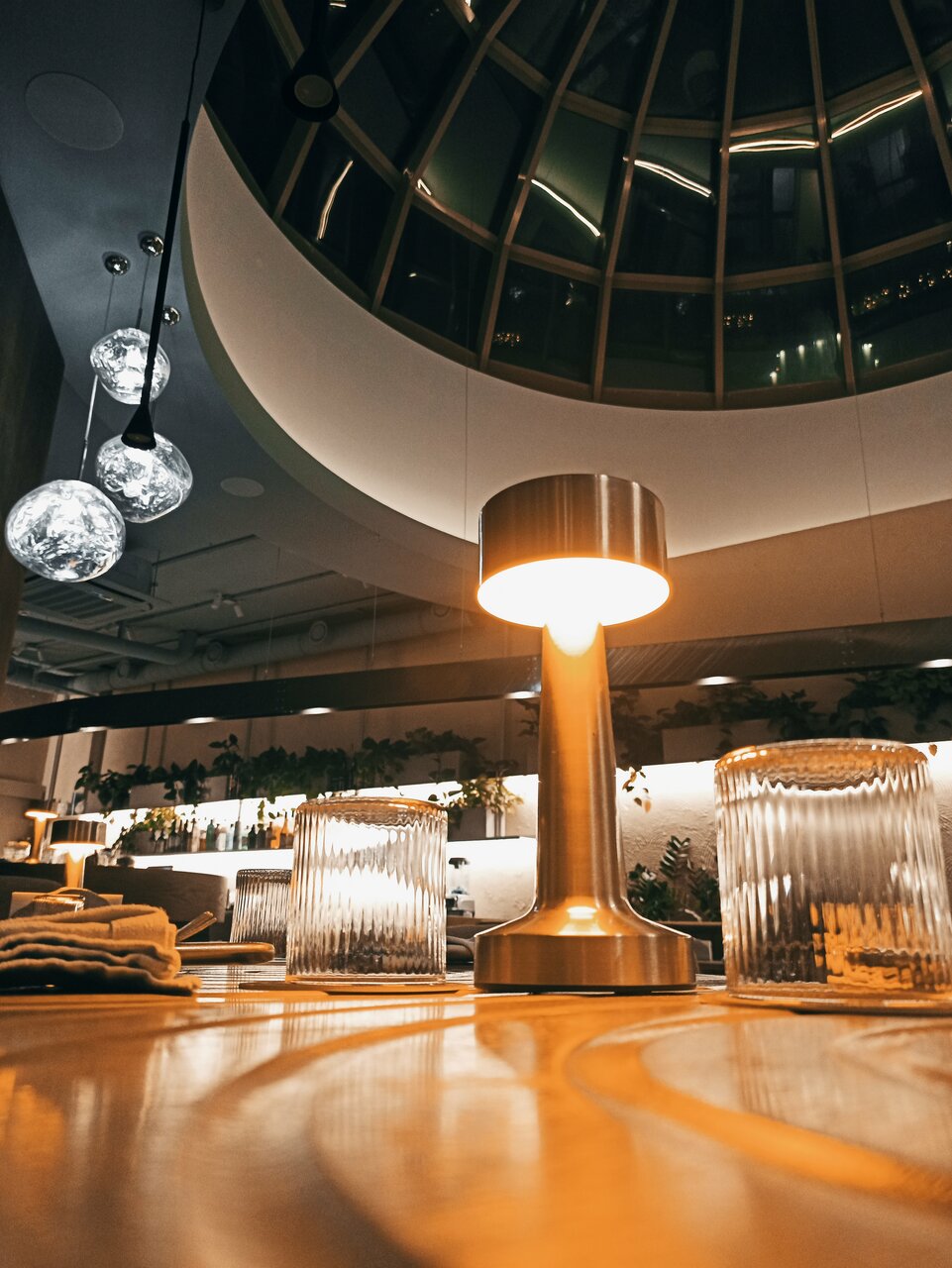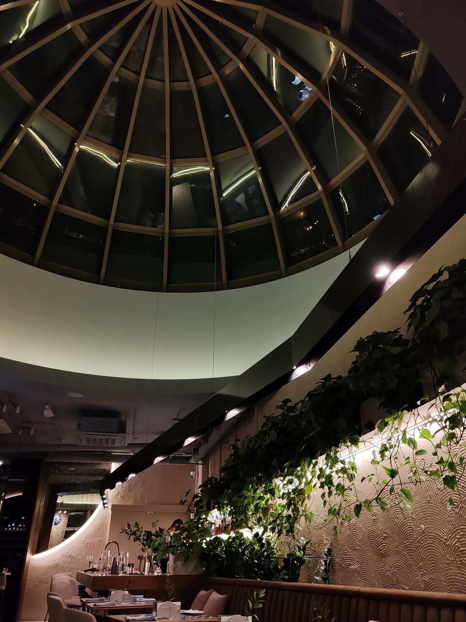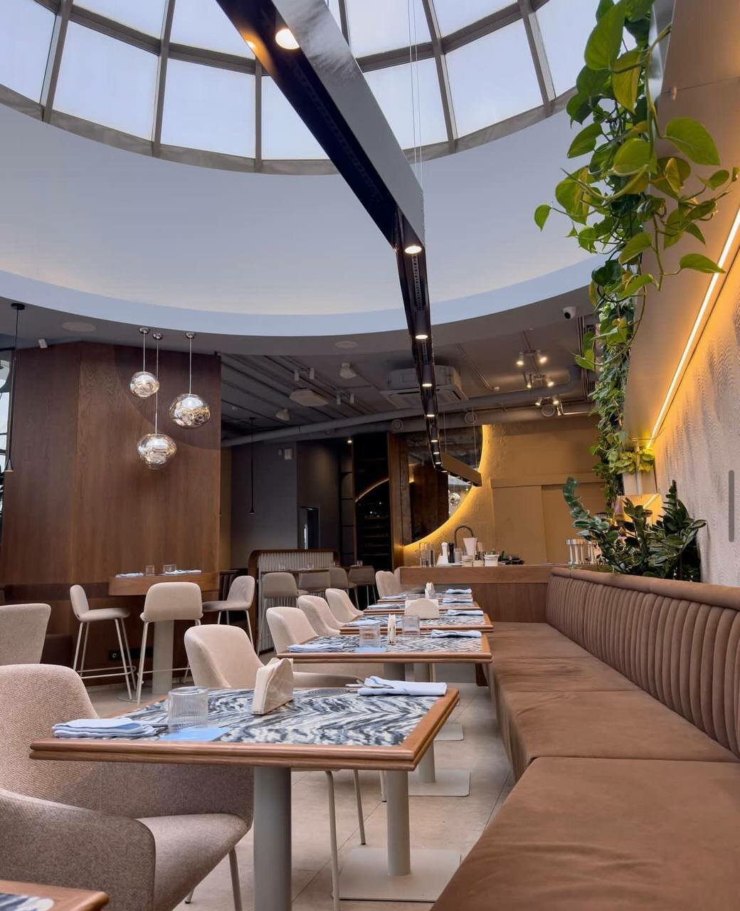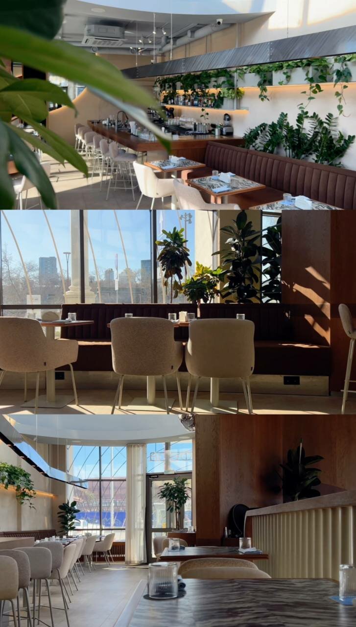 Ресторан представляет собой эстетичное место, где можно насладиться не только вкусной едой и напитками, но и прекрасным видом благодаря огромному стеклянному куполу, расположенному над бистро. Этот купол символизирует гармонию между природой и городской средой, позволяя гостям ресторана любоваться окружающим миром во время трапезы.