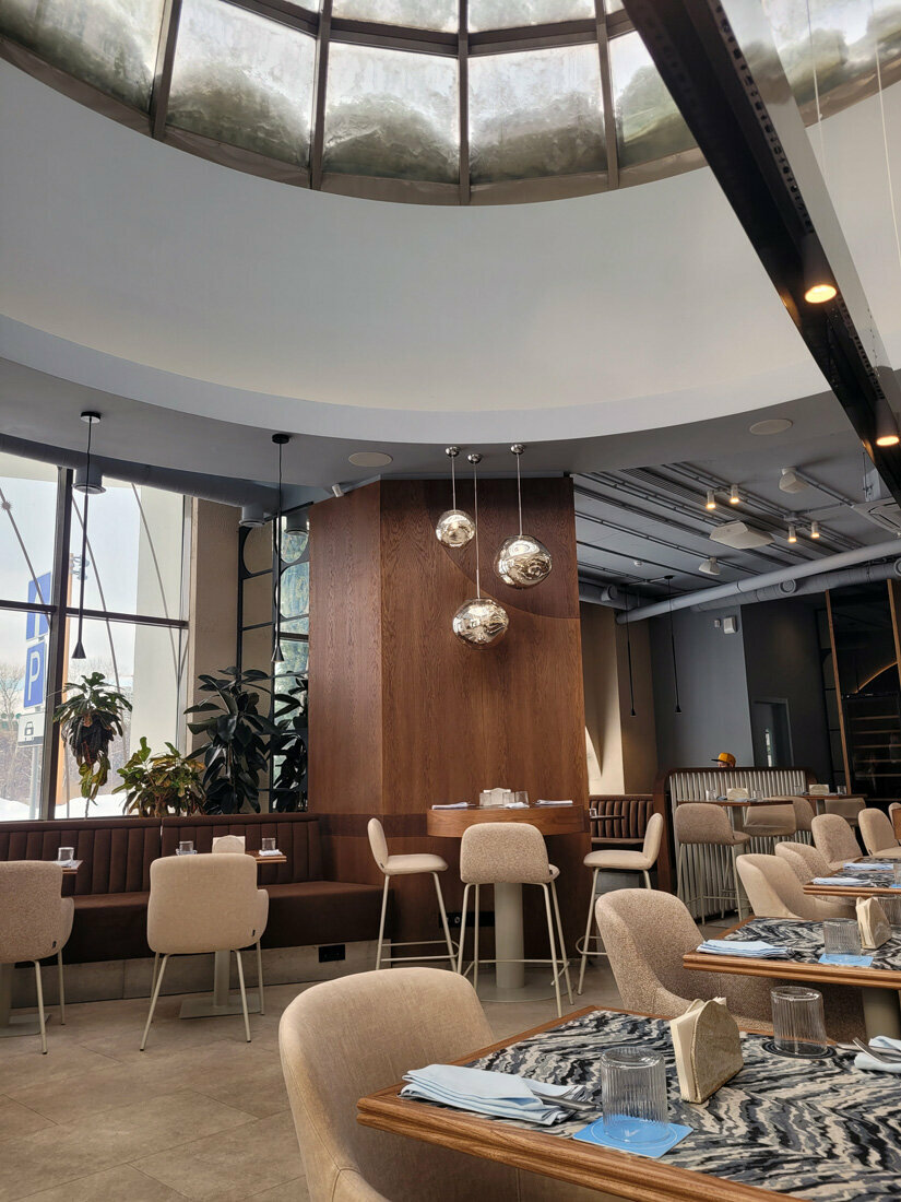 Жаль что ресторан закрылся, приятное место, красивый купол, вкусная кухня. По утрам в выходной можно было позавтракать в спокойной атмосфере, без брони и очереди чтобы сесть.